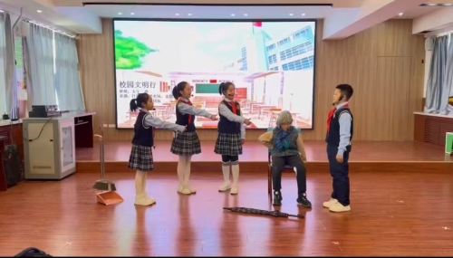 文明礼仪情景剧 弘体尚美,潮平岸阔好扬帆 为锻炼学生体魄,发展学生特长,学校成立了学生运动队,常年开展活田径、乒乓球、排球、足球等大课间活动,让每一位学生都参与到体育锻炼中?!八酢闭咴谘B涞厣ǎ璧干缤?、围棋社团、烹饪社团、艺术社团等社团为学生发展个性,结出累累硕果,发展特长提供了广阔的舞台。学校每年组织开展爱老敬老、清明祭英烈、跳石沟综合实践等社会实践活动,走进敬老院、烈士陵园、辽宁帝华味精食品有限公司等进行思政教育。引导学生从课上走到课下,从校内走到校外,从思想认知到亲身体验,从实践体验逐步内化为终身受益的行为习惯和道德自觉。